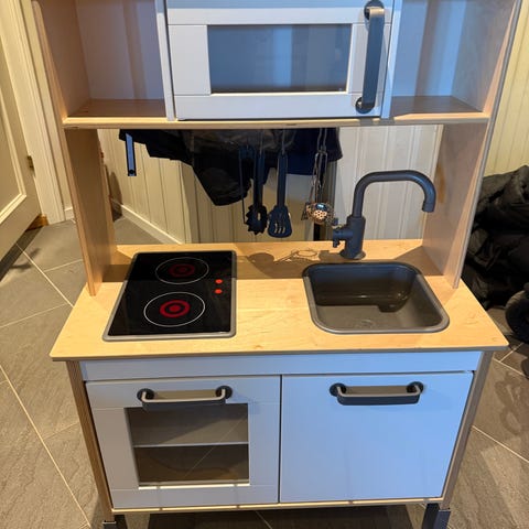 Lekekjøkken med platetopp som både lyser og gir fra seg lyd. Det har en stekeovn og en mikrobølgeovn. Det er også god plass til oppbevaring. Kjøpt fra biltema. Selve kjøkkenet er som ny.