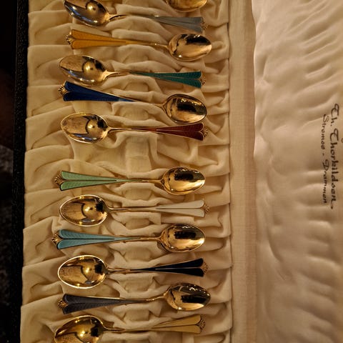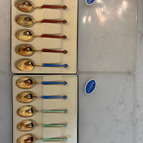 Teskjeene har skaft med grønn emalje og dekorert avslutning. Skjehodet og baksiden fremstår i metall med gyllen overflate. Leveres i eske med individuell plass til hver skje.