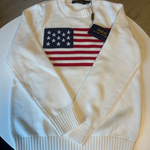 Ralph Lauren Polo genser for herre i størrelse L. Genseren er i beige bomull med rund hals og ribbestrikkede kanter nederst og på ermene. På brystet har den et stort, strikket amerikansk flaggmotiv med liten «Polo»-tekst integrert i mønsteret. Materiale: bomull. Farge: beige med rødt, hvitt og blått flaggmotiv.