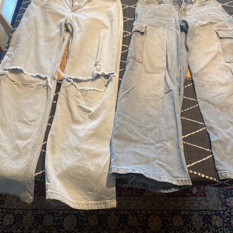 Vi har for mange bukser i disse størrelsene til at buksene blir brukt her i huset. De er lite brukte, begge to. Det er ikke veldig mye forskjell i størrelse, buksene har blitt brukt samtidig her hos oss.