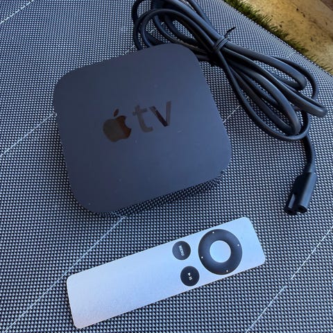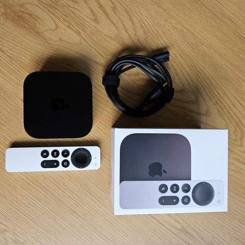 Apple TV med fjernkontroll og strømkabel