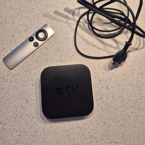 Apple TV med medfølgende fjernkontroll og strømkabel. Enheten kobles til TV via HDMI (kabel ikke synlig på bildene). Strømtilkobling og nettverkstilkobling via Ethernet-port eller innebygd Wi-Fi. Fjernkontrollen har navigasjonsknapper, menyknapp og avspillingskontroll. Leveres med original emballasje som vist på bildene. Hdmi kabel følger ikke med.