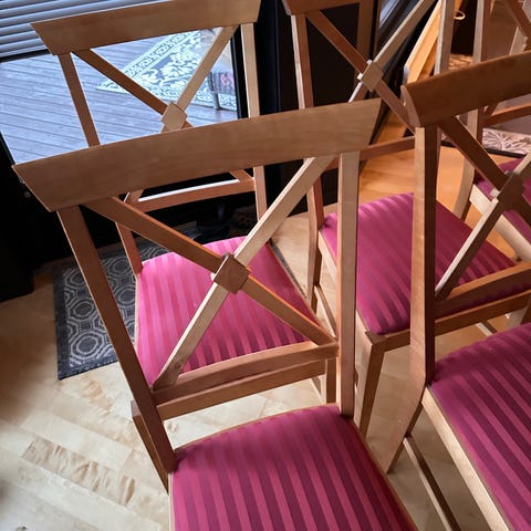 Selger 6 solide og komfortable stoler i ekte rotting med brune sitteputer. Stolene har høy rygg og sitter veldig godt – passer perfekt rundt spisebord, i vinterhage eller på hytta.