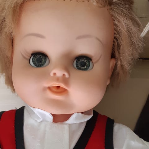 Detaljer: 50 cm høy, vinylkropp, velfungerende soveøyne og originalt lyst hår. Ingen falming eller flekker.