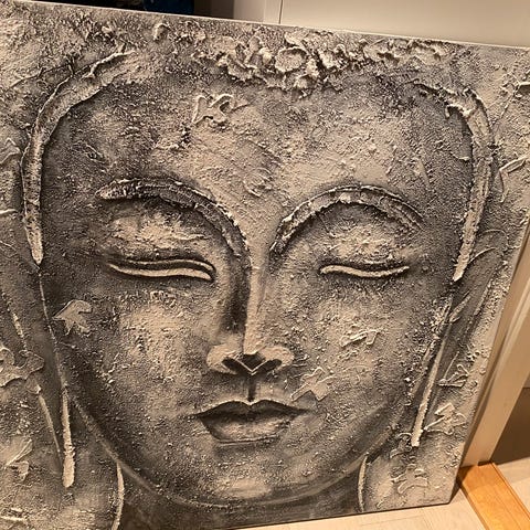Veggbilde sett bestående av fem separate lerreter som til sammen danner et motiv med buddhafigur og kirsebærblomster i lyse, dempede toner. Rektangulære lerreter i ulike høyder som kan henges samlet som ett motiv eller hver for seg. Passer som veggdekor i stue, soverom eller andre oppholdsrom.
