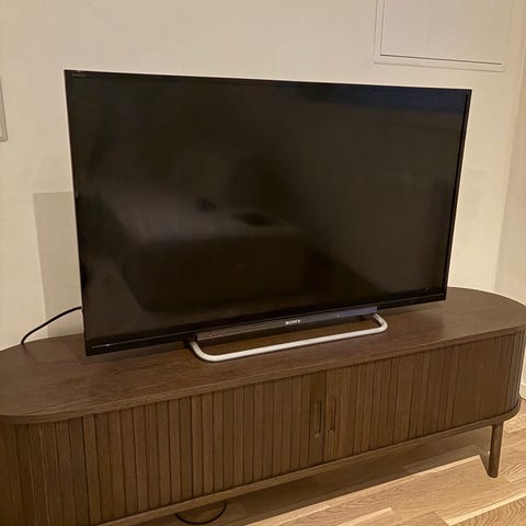 Sony TV med bordstativ. Modellen har innebygde knapper på siden for strøm, volum, programvalg og meny. Fjernkontroll følger ikke med.