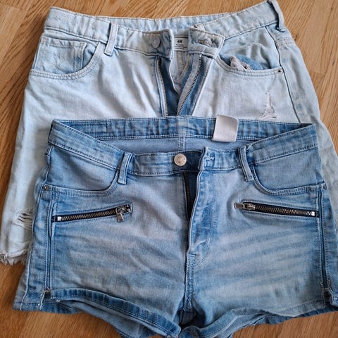 To H&M shorts'ar i størrelse 170. Shortsene er i bomull. Klassisk modell med glidelås og knapp i front, samt lommer foran og bak. Egnet til hverdagsbruk og fritidsaktiviteter.