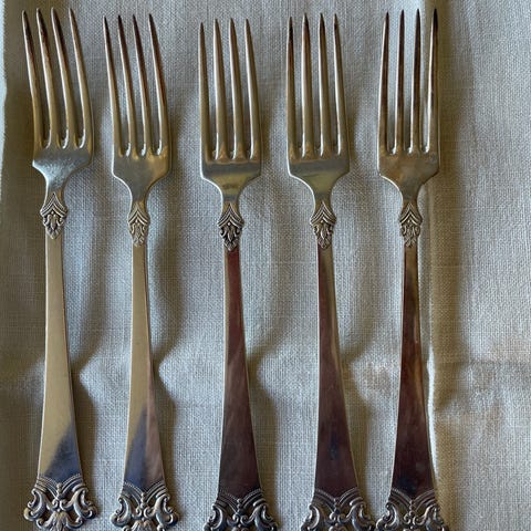 Selger tre spisegafler i det klassiske mønsteret Flat Rose. Produsert av Magnus Aase i Bergen. Ekte sølv.