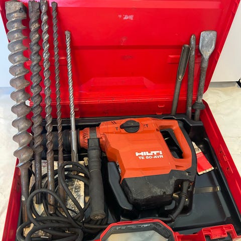 Hilti TE 1000‑AVR meiselhammer i rød og svart. Elektrisk drevet meiselhammer med håndtak foran og bak for bedre kontroll under arbeid. Leveres med strømkabel som vist på bildene. Egnet for tyngre meisle- og rivingsarbeid i betong og murverk. Modellbetegnelsen TE 1000‑AVR er merket på maskinen.
