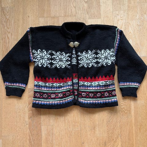 Nydelig ullkofte str. 98/ 3 år selges rimelig. Vet dessverre ikke garntype, men en type kløfri ull. Svært pent strikket og svært pent brukt.