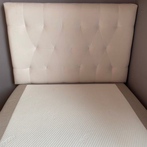 Selger seng med gavl. . Fra belliani. Kjøpt i fjor. Med madrass. 180x200 madrass. Stått ubrukt kjeller i mnder. Med fløyelstrekk. Lys beige. Selges med madrass. Nesten ikke brukt. Må ordne skruer selv. Ganske lett å få tak i dem. De har blitt borte i flyttelass.
