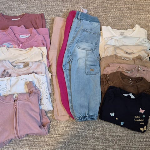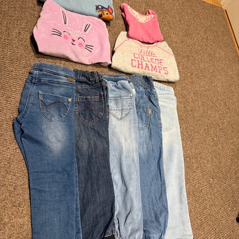 Jente str. 98/104: 6 bukser, 1 par tykke ullsokker, 3 kjoler, 1 cardigan, 1 genser.