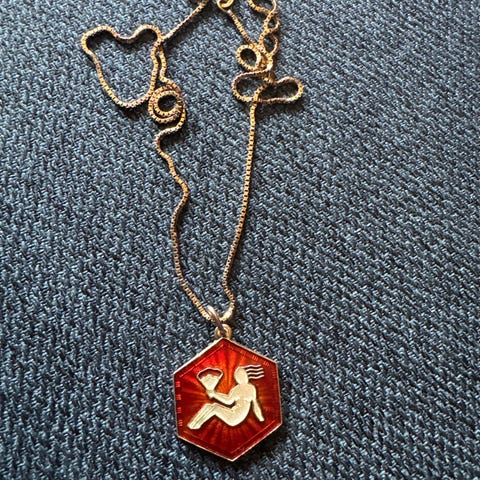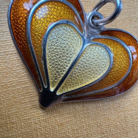 David-Andersen anheng . Anhenget har sekskantet form med dekorert motiv på forsiden og inngravering på baksiden. Leveres med kjede som vist på bildene. Materiale er sølv og emalje