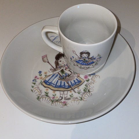 🔍 Kahla, DDR, GDR, Øst-Tyskland, vintage, porselen, kopp, barnekopp, bie, sommerfugl, retro, samleobjekt, nostalgi, antikk