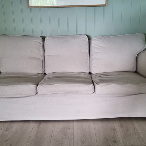 Lys beige ektorp sofa med sjeselong fra IKEA. Sofaen har god sittekomfort, putene har ingen skader. Sofaen har et praktisk trekk som enkelt kan vaskes og byttes ut om annen farge ønskes. Nyvasket trekk. Sjeselongen er 163dyp.