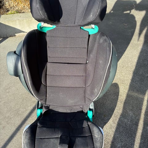 Farge er mørk grå. Kjøpt nytt selv benyttet ca i 4år. Høyde på nakkestøtte kan enkelt justeres opp og ned for å tilpasse barnets størrelse.