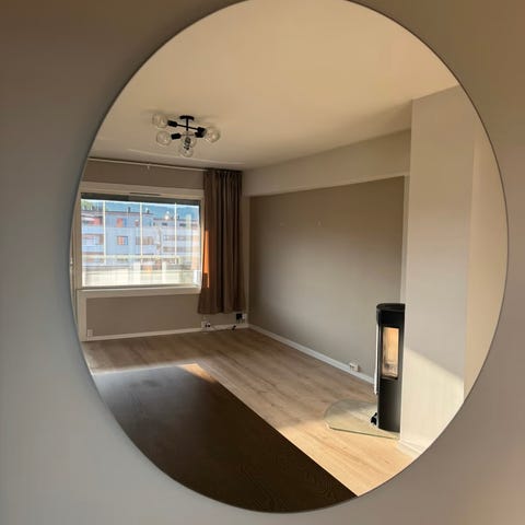 Passer i stue, gang eller soverom som funksjonelt speil og veggdekor.