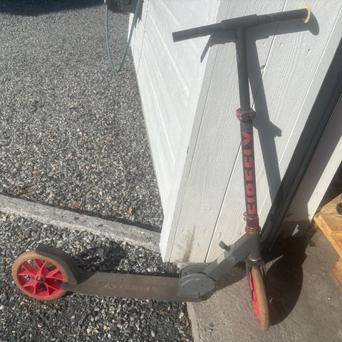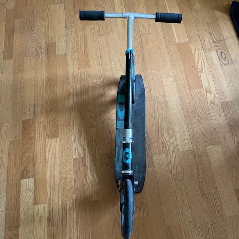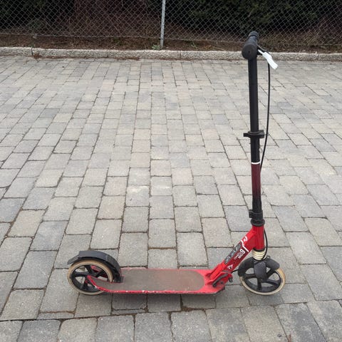 sparkesykkel med store hjul i rød og svart farge. Modellen har bredt ståbrett og store plastikkhjul med gummikant for jevn rulling. Styrestangen er justerbar i høyden og kan foldes sammen ved hjelp av låsemekanisme. Sparkesykkelen passer til bruk på jevne underlag som asfalt og fortau. Se bilder for detaljer.