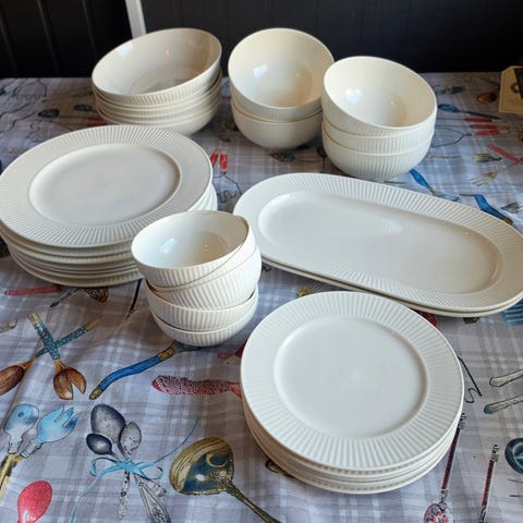 Principado servise i hvitt porselen. Serviset består av ulike deler (152 stk) som middagstallerkener, asjetter, dype tallerkener, serveringsfat og kopper, tefat og asjetter. Delene har en diskret, preget dekor langs kanten i samme hvite farge som resten av porselenet. Egnet til bruk som komplett servise til måltider og servering. Merket «Principado Spain» på undersiden av delene. Pris kan diskuteres ved hurtig avgjørelse og hentes i Trondheim, men kan sendes på kjøpers risiko.