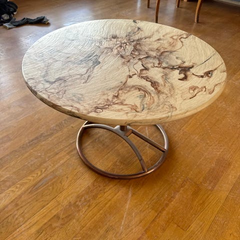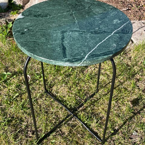 Et lite rundt bord med marmorlook, som absolutt ikke er hverken marmor eller annen type stein. Vet ikke hva slags materiale det er laget av, men det er tungt, som om det skulle vært stein. «Venene» er sjatteringer av rødt, rosa og rødlilla. Ø75 cm. Kan leveres etter avtale mellom Kongsberg og Drammen.