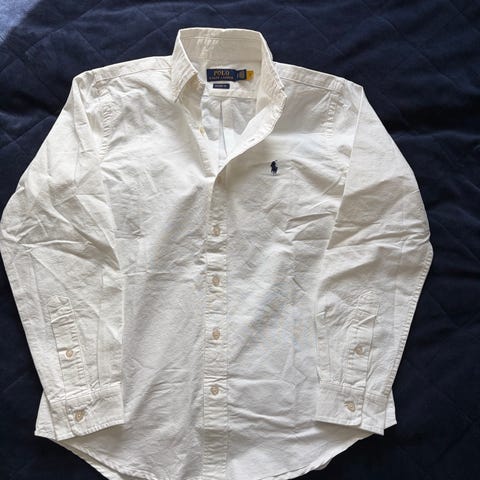 Ralph Lauren skjorte for herre i størrelse L. Skjorten er hvit og laget av bomull. Klassisk modell med krage og knapper i front, samt mansjetter med knapper. Diskret logo på brystet. Passer til både hverdagsbruk og mer formelle anledninger.