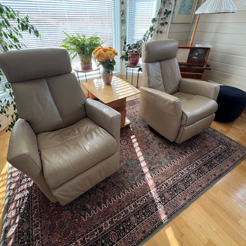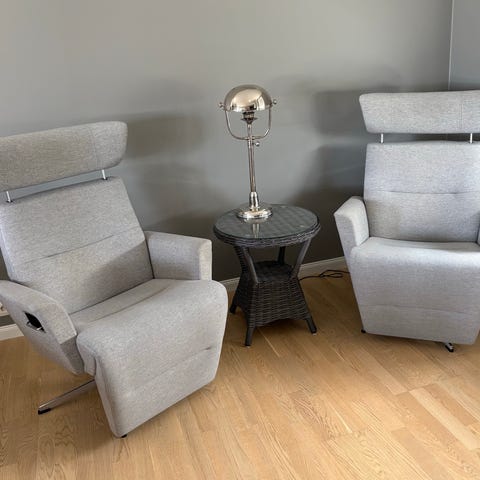 2 stk. hele og fine lenestoler i grått stoff med nedleggs rygg og fot hviler.