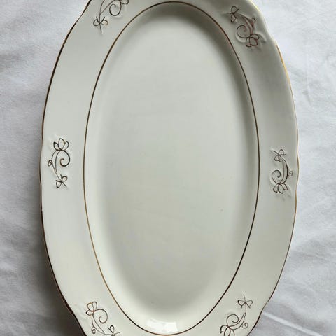 Ovalt serveringsfat i porselen med gullkant