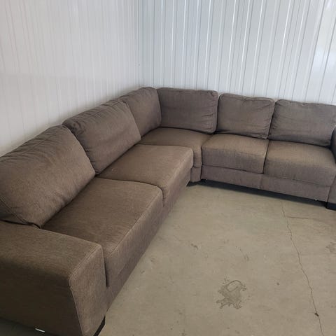 Stor hjørnesofa i lakserosa skinn og stoff gis bort mot henting. De tre delene på sofaen er ikke montert sammen, så her kan man finne en løsning for å skru dem sammen.