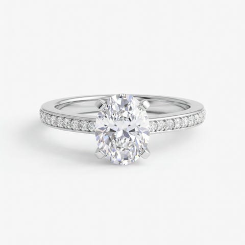 Ring med 1 karat oval moissanitt og pavé-bånd. Belagt 18 karat hvitt gull.