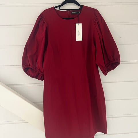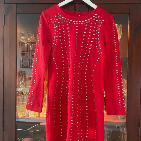 Rød kjole av merket Secret of S i størrelse L. Stoffet har litt tyngde og tykkelse som faller fint rundt kroppen. Lengde ca. 95 cm fra skulder.