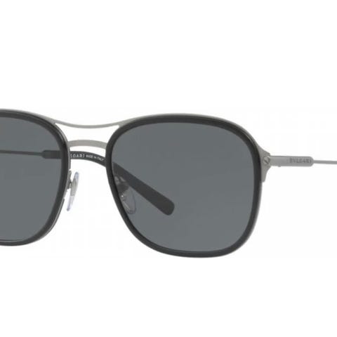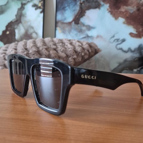 Selger et par stilrene Gucci solbriller i gull og sort med grå linser. Kjøpt på Zalando for 3500 kr.