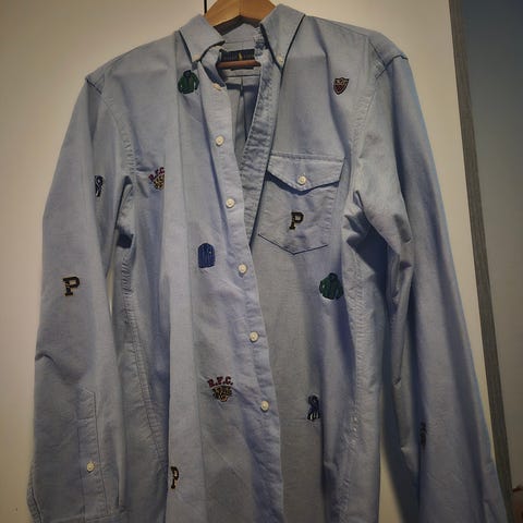 Ralph Lauren skjorte for herre i størrelse L. Skjorten er blå og laget av bomull. Klassisk modell med knapper i front og knapp i kragen. Brodert logo på brystet. Passer til både hverdagsbruk og mer formelle anledninger.