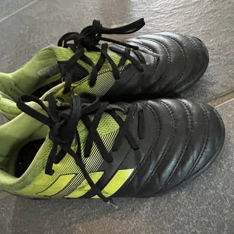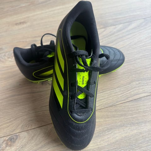 Adidas Copa fotballsko i størrelse 41 Skoene er i svart med neongule detaljer og innside. Overdelen er i syntetisk materiale, og yttersålen har knotter tilpasset spill på kunstgress eller grus. Modellen har snøring for justerbar passform. Egnet som fotballsko til trening og kamp.