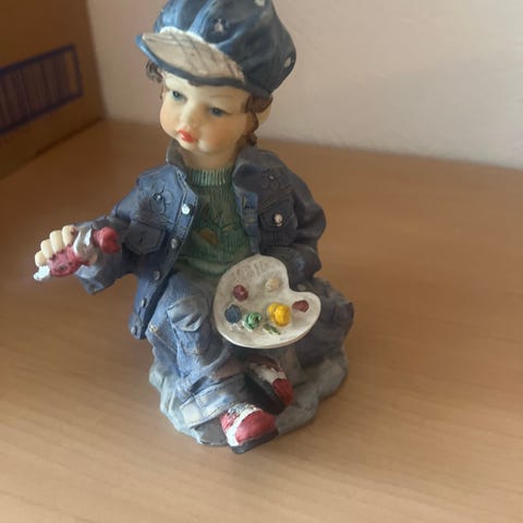 Dekorativ figur som forestiller en gutt med hatt som holder en kurv. Figuren er i svart farge og står på en liten sokkel med strukturert underlag. Egnet som innredningsdetalj på hylle, kommode eller bord i stue, gang eller andre rom i hjemmet.