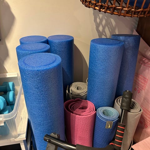 Treningsmatte / yogamatte i skum i to farger: én lilla og én turkis. Begge mattene er sammenrullbare. Den lilla matten har bærereim som gjør den enkel å frakte og oppbevare. Skummaterialet gir demping mot underlaget og egner seg til øvelser på gulv som styrketrening, uttøying, yoga eller pilates. Mattene kan brukes innendørs på harde gulv eller andre flater der det er behov for et mykere underlag.