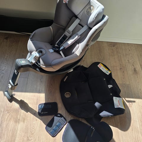 Cybex barnesete størrelse 18 i svart farge. Vendbart 360 grader, slik at det er lett å ta barnet ut og inn av bilen. Barnesetet har integrert internsele og justerbar hodestøtte for å gi tilpasning til barnet. Setet festes i bilen med Isofix-fester, som vises på bildene. Illustrasjonene på siden av setet viser bruk for barn fra ca. 45–105 cm og maks 18 kg, samt hvordan setet skal monteres og justeres. Egnet som bilstol til småbarn innenfor angitt høyde- og vektområde, i henhold til produsentens anvisninger. Setet er brukt i bestemor sin bil i to perioder. Ikke utsatt for kollisjon. Nyvasket etter at bildene ble tatt.