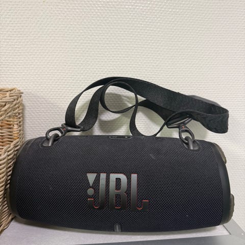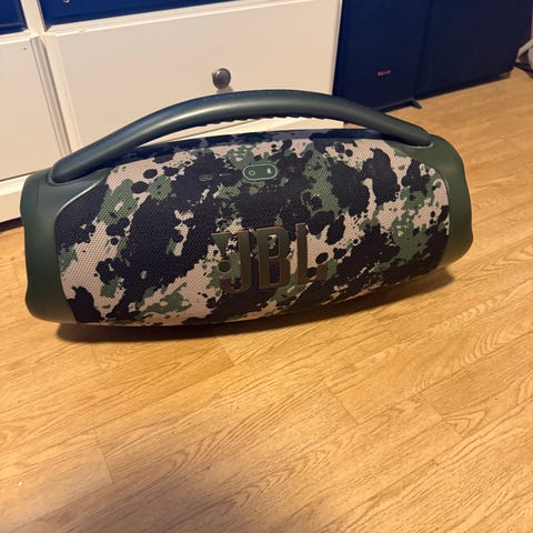 JBL Boombox bærbar høyttaler i svart farge. Modellen er utformet som en robust, håndholdt Bluetooth-høyttaler med bærehåndtak. Høyttaleren har tilkoblingsporter skjult bak en gummiluke, blant annet for lading og USB-tilkobling. Egnet for trådløs musikkavspilling fra mobil, nettbrett eller andre enheter med Bluetooth-støtte. Passer til bruk både hjemme og på farten der man ønsker bærbar lyd.
