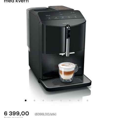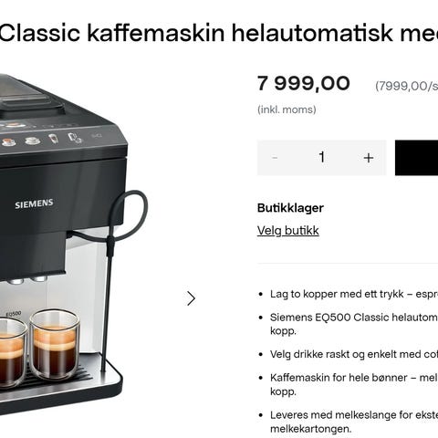 Jeg vurderer å selge vår Siemens helautomatiske kaffemaskin i helsvart grunnet plassmangel. Veldig fornøyd med maskinen, så selges kun til riktig pris. Nypris: 8.995kr.