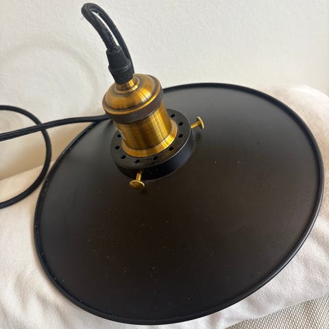 taklampe. Lampen har skjerm i metall med gullfarget utside og lys innside for god refleksjon av lyset. Innvendig er det en perforert metallplate og en mørk metallbøyle rundt pæresokkelen. Lampen er beregnet for montering i tak og passer til vanlig lyspære med standard sokkel (se bilder for type). Egnet som allmennbelysning over bord eller i oppholdsrom.