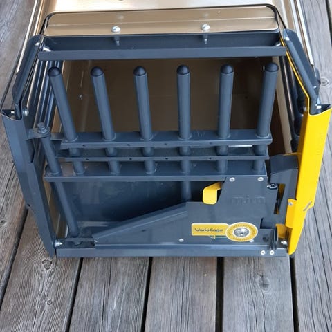Sammenleggbart stoff bur til storhund. Litt dårlig glidelås på kortsiden, men den fungerer. Full funksjon i glidelås på langsiden. Har bærehåndtak. Kan foldes sammen for enkel oppbevaring.