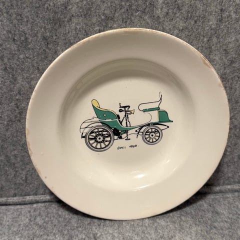 Shell reklame lite fat med 1896 Modell antikk bil, les annonsen