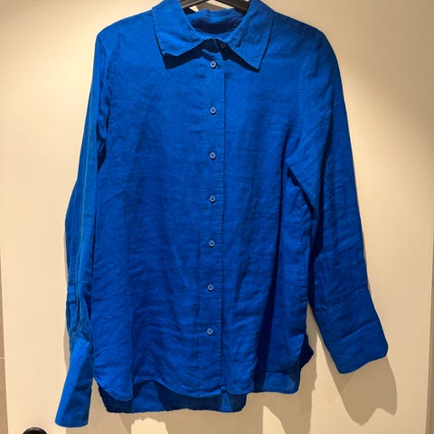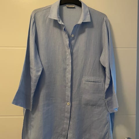 Blå skjorte/bluse fra Zimmermann i str 0. Jeg er str 36 vanligvis, men opplever at toppene til Zimmermann er litt store + at denne er litt oversized. Den er i et materiale som heter ramie- som er veldig likt som min. Kanskje litt glattere i overflaten.
