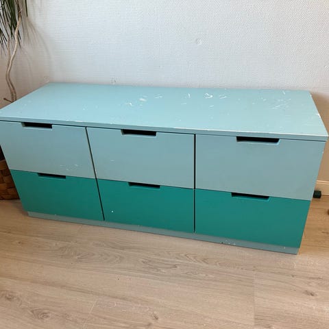 2 stk IKEA EXPEDIT/(forløper til KALLAX i hvit) kommode og skap med dører og bokser. Noen dører i høyglans (blå/turkis)