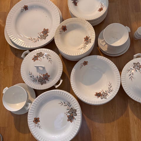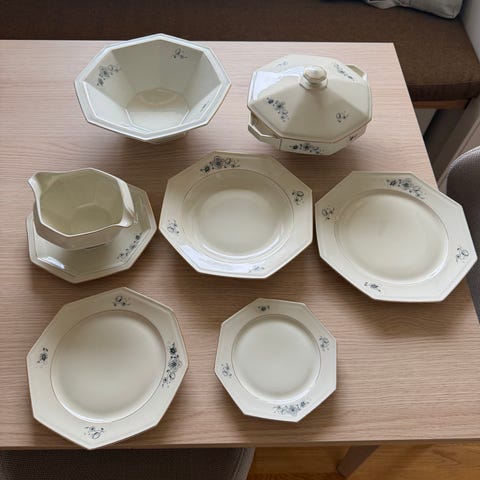 Selger brukt gammelt middagsservice. 6 middagstalerken, 2 serveringsfat, suppeskål, sausenebb og en ovalskål. Dødsbo. 275 kr eller kom med et bud.