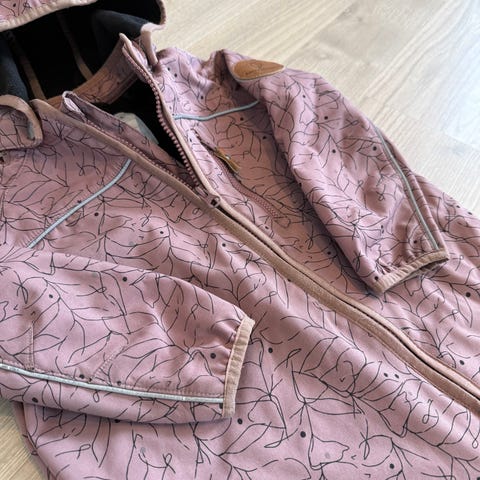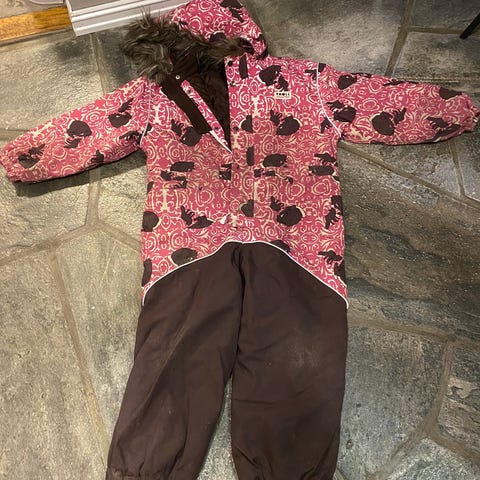 POMPdeLUX parkdress for barn i størrelse 110. Dressen er lys rosa med mønster og laget i polyester. Modellen er unisex og har avtagbar hette, hel glidelås foran og strikk nederst i bena med fotstrikk. Forsterkede felt på knær og sete gir ekstra slitestyrke.