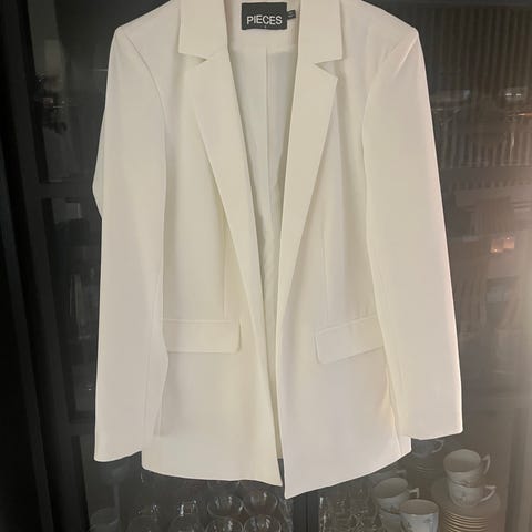 mbyM blazer for dame i størrelse M. Blazeren er hvit og laget av polyester. Klassisk modell med krage og slag, knapp forann. Glidelås lommer. Perfekt til hverdagsbruk som fest. Pent og lite brukt.