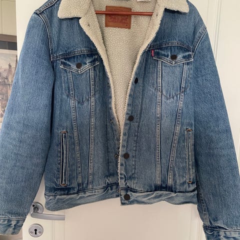 Levi's denimjakke for herre i størrelse M. Jakken er laget i blå denim med teddyfôr på innsiden for ekstra varme. Klassisk jeansjakke-design med krage, knappelukking foran og brystlommer med klaff og knapp. Ermene har mansjetter med knapp. Passer som ytterjakke i overgangssesonger eller på kjølige dager.
