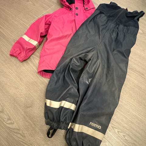 Regnsett fra Reima med rosa jakke og mørke blå selebukse. I god stand sett bort fotstrikkene som kanskje må byttes ut etter hvert.