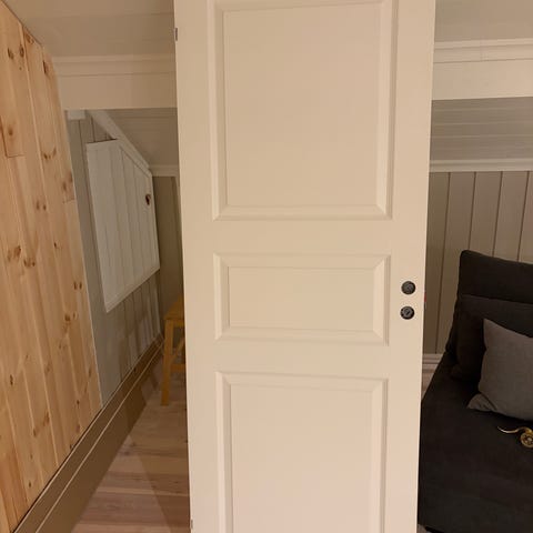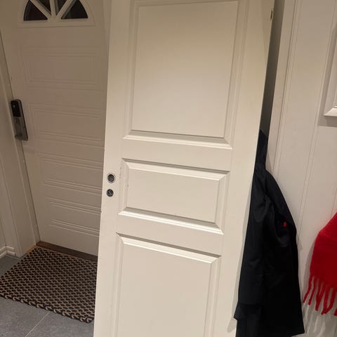 Gir bort Swedoor kompakt dør. Døren er ubrukt, men har en liten skade på siden som nesten ikke er synlig (se siste bilde). Den er kappet, så målene er ikke standard lengre.