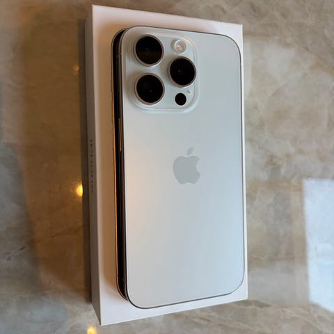 Apple iPhone 15 Pro smarttelefon med 128 GB lagringskapasitet. Modellen har tredobbelt hovedkamera på baksiden og frontkamera i skjermens øvre del. Telefonen leveres i en blå fargetone med tilhørende original eske som vist på bildene. Egner seg for vanlig bruk som samtaler, meldinger, sosiale medier, foto, video og apper som krever god ytelse og lagringsplass.